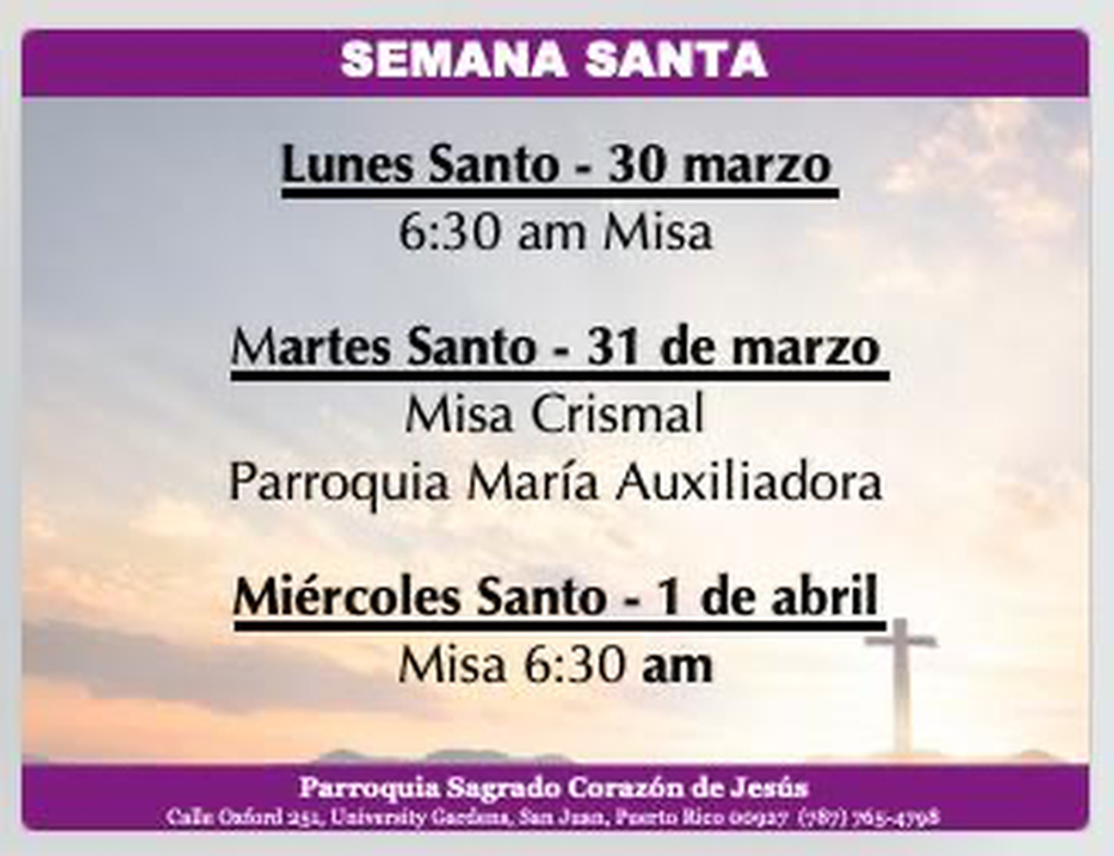 Martes a Viernes 6:30am., Sábado 7:00am. en la Capilla de la Parroquia.