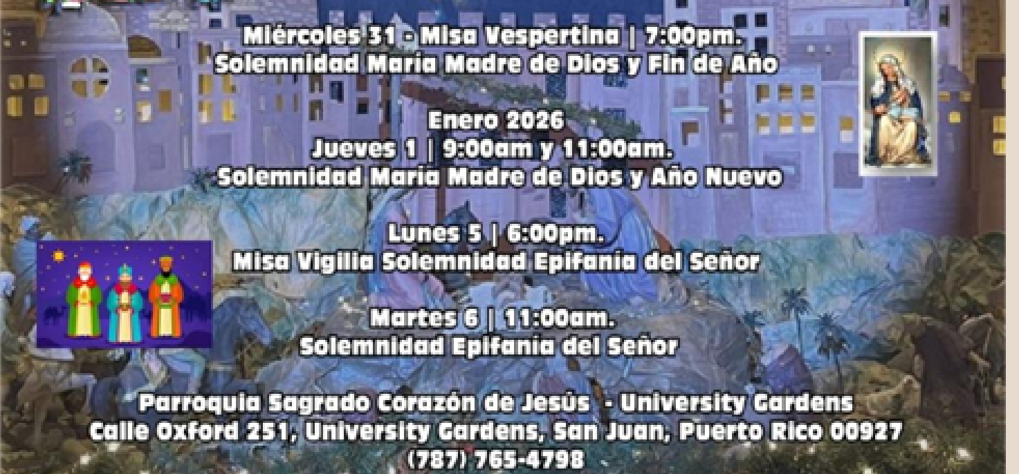 Domingo: 9:00am., 11:00am. y 7:00pm.
