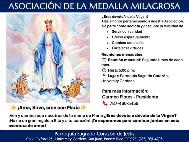 Martes a Viernes 6:30am., Sábado 7:00am. en la Capilla de la Parroquia.