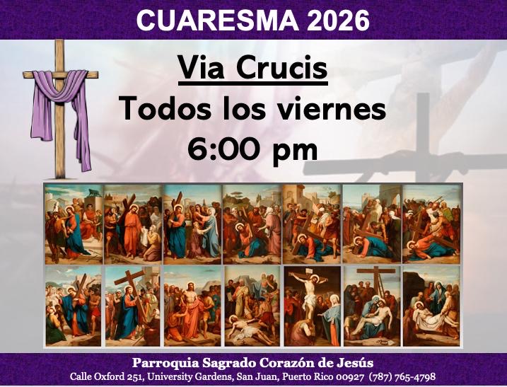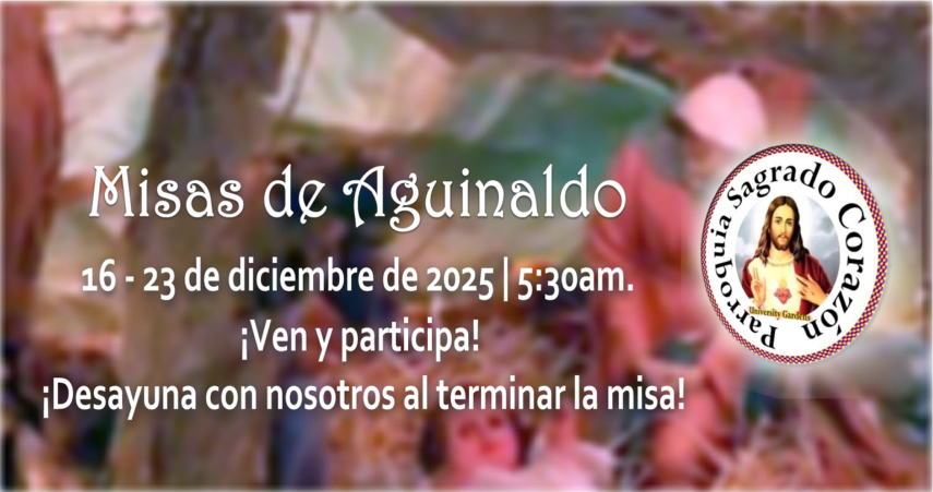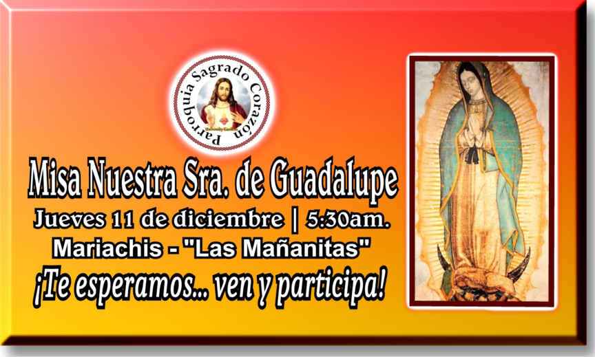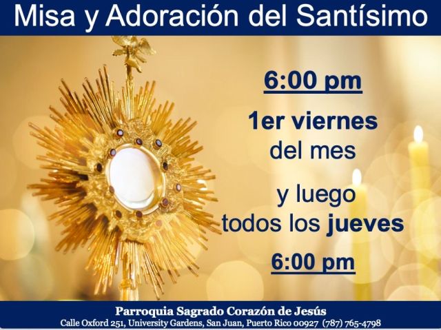 Martes a Viernes: 6:30am., Sábado: 7:00am. y los Domingos a las 11:00am. por el canal de internet de YouTube de la Parroquia.